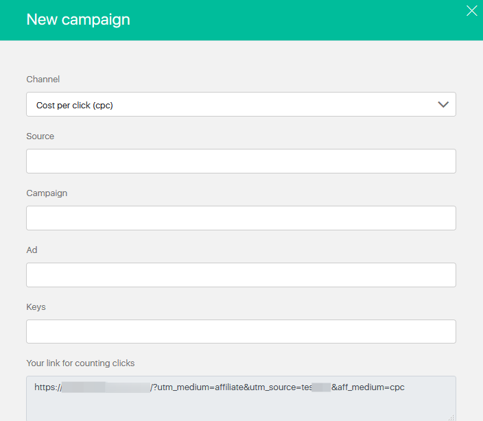 Clicking on the Add Advertising tag button opens the New Campaign window that allows you to add UTM-tags for calculating the advertising channels.